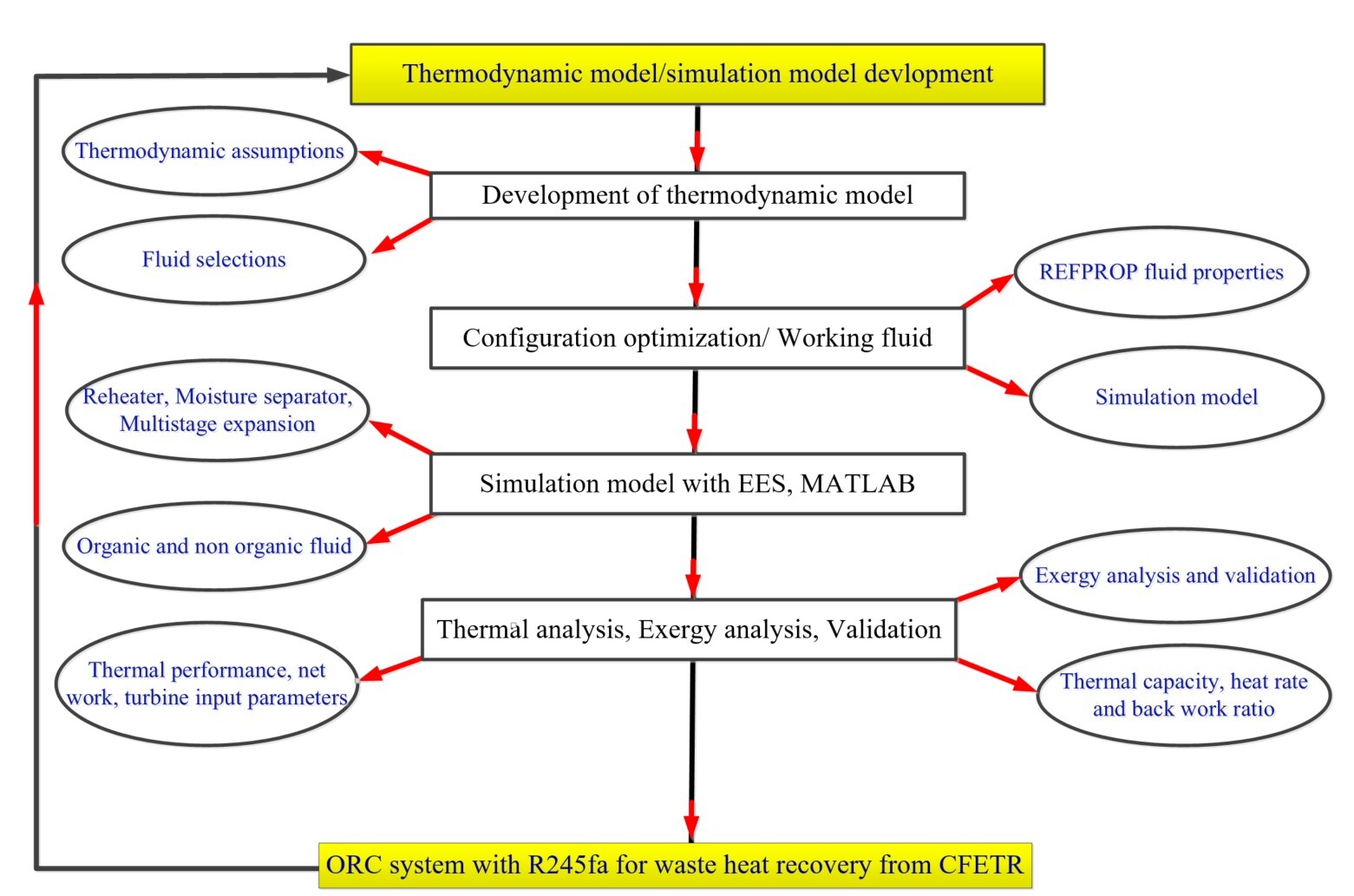 To tackle the complex thermodynamic and heat integration issues, the team developed advanced simulation models using Engineering Equation Solver (EES) for cycle analysis and MATLAB-based LAMP modeling for dynamic system configuration. These tools enabled a comprehensive investigation and optimization of the ORC configuration, leading to significantly improved thermal performance. The research addresses this challenge by designing and optimizing a thermal cycle that efficiently converts this residual heat into useful electricity using an ORC system. The study demonstrates how this approach improves thermal efficiency and supports the sustainable operation of future fusion power plants. The innovative design of ORC for waste heat recovery not only demonstrates how low-grade waste heat can be effectively utilized in future fusion reactors but also provides a model framework that can be adapted to other high-temperature energy systems. The workflow layout and schematic of the innovative Organic Rankine Cycle coupled with supercritical Carbon dioxide Brayton cycle with CFTER have been shown in Fig. 1 and 2 as below: