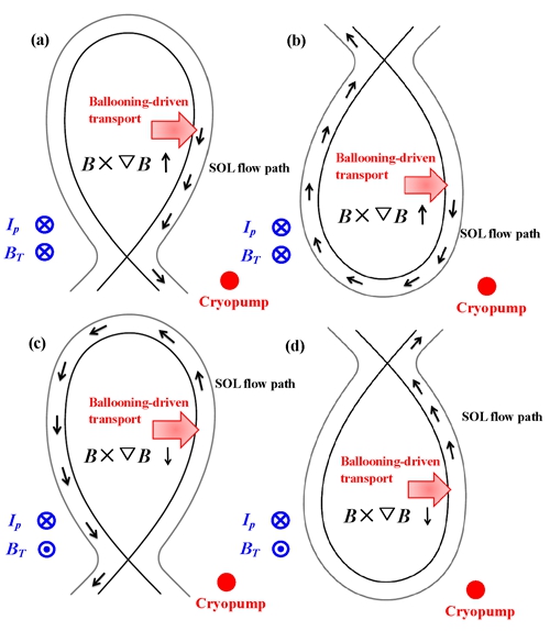 Figure: Schematic view of parallel plasma flow at SOL region in LSN and USN configurations for B×?B ↑ ((a) and (b)) and B×?B ↓ ((c) and (d)) on EAST. The plasma current has never changed (counter clockwise).