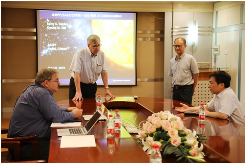 On May 31-June 1, GA vice president, Tony Taylor and head of DIII-D program, David Hill visited ASIPP and witnessed this first joint experiment in new EAST control room.